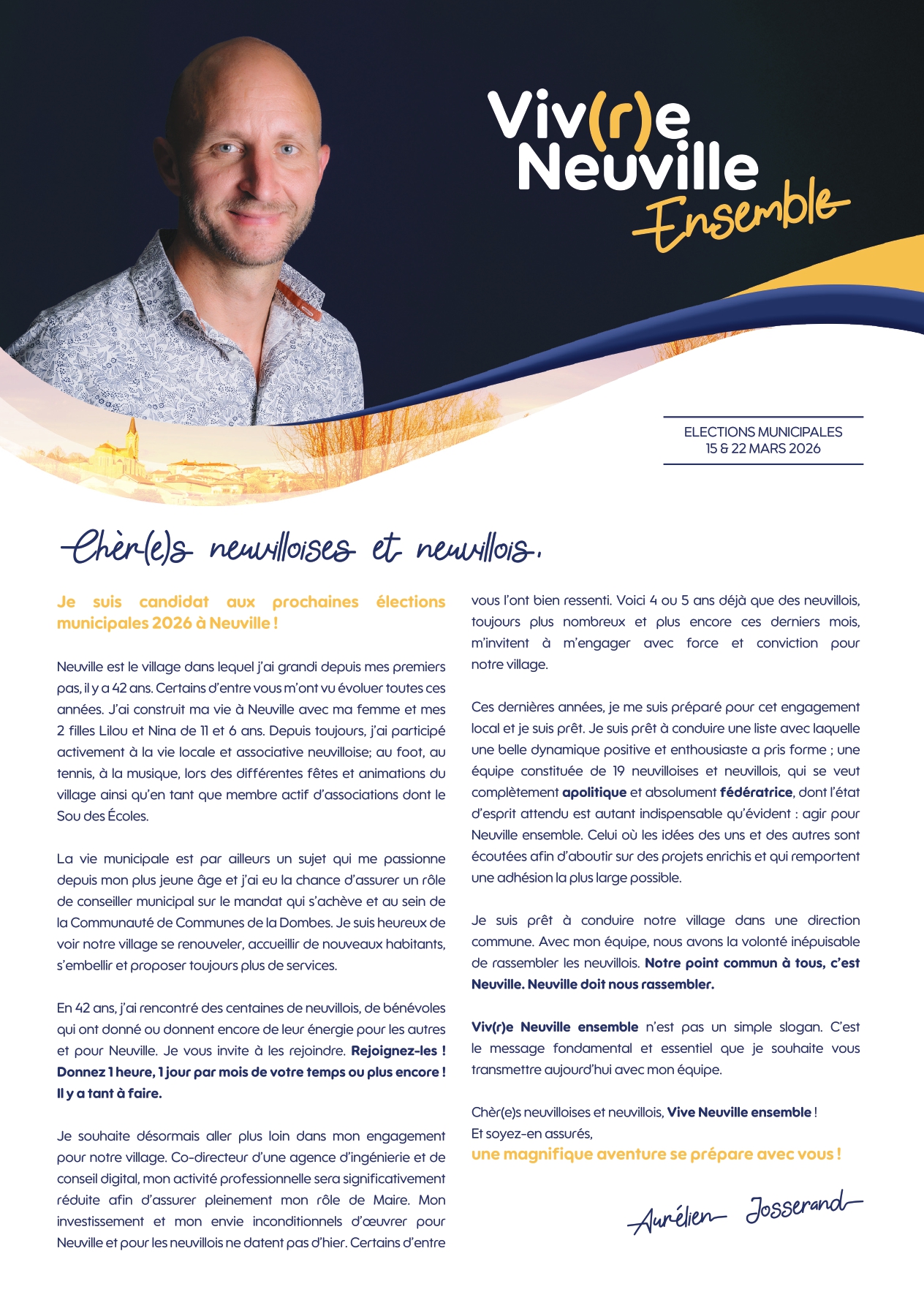 Sous l’impulsion d’Aurélien Josserand, tête de liste, nous choisissons de mener une campagne pas comme les autres, différente, nouvelle, positive :